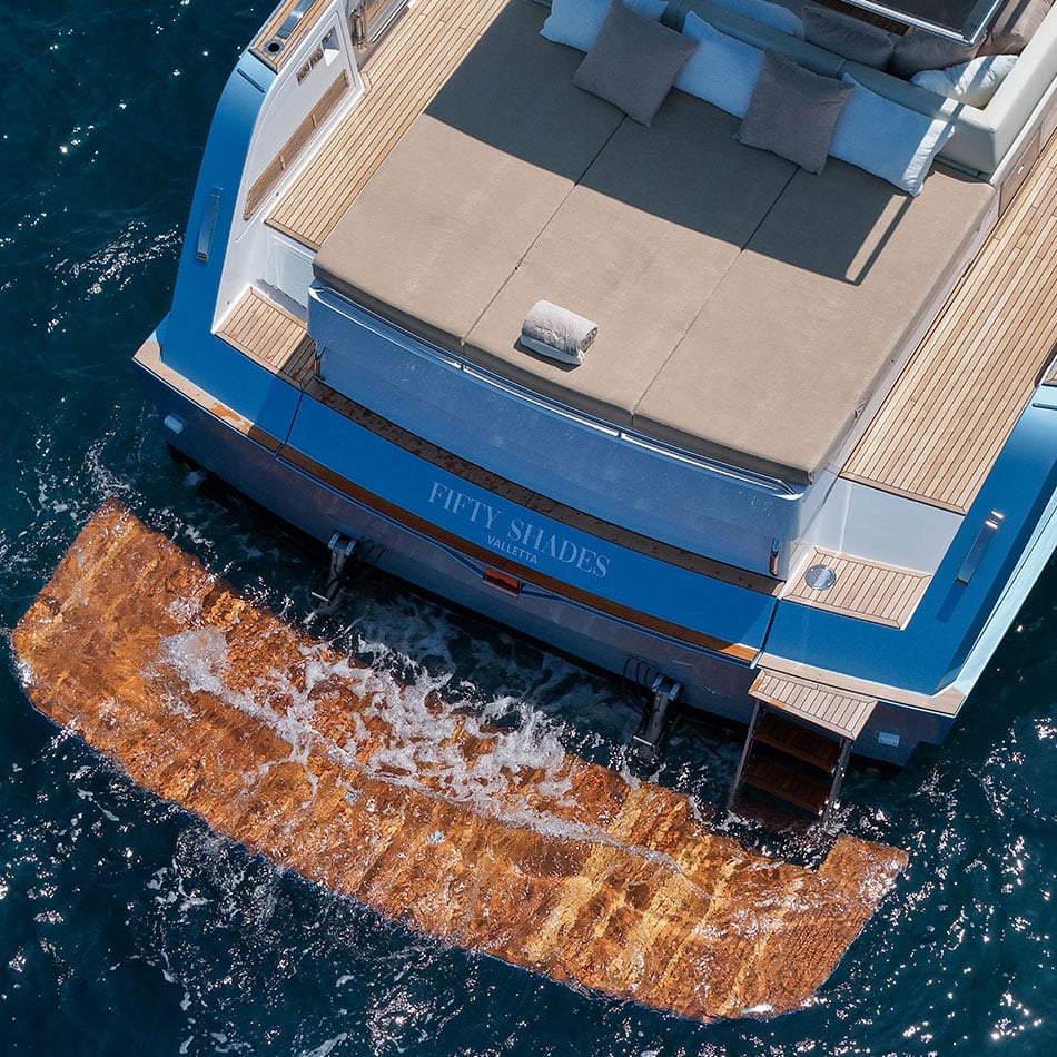 The living space on board is generously laid out to provide an atmosphere of absolute relaxation, with a large bathing platform, a well-equipped outdoor galley, and a uniquely designed interior offering comfortable headroom.