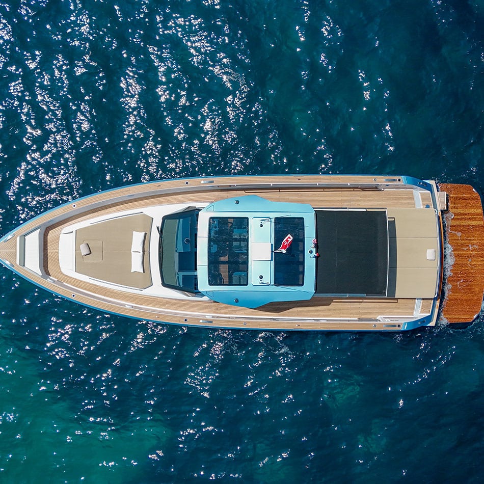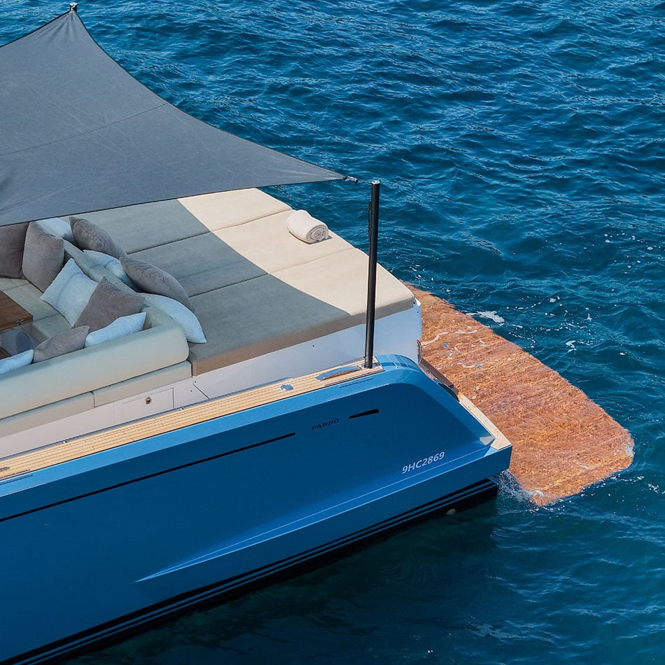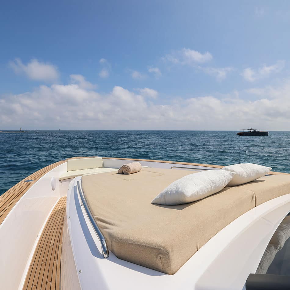 The PARDO 50 is equipped to offer its passengers the utmost comfort. Take advantage of its well-stocked fridges, high-fidelity sound system for the perfect ambience, and snorkelling equipment for exploring the seabed. Spacious sundecks invite you to relax, while the shower and toilet ensure optimum comfort. What’s more, air conditioning and stabilisers at sea and at anchor guarantee an unrivalled cruising experience, even in rough seas.