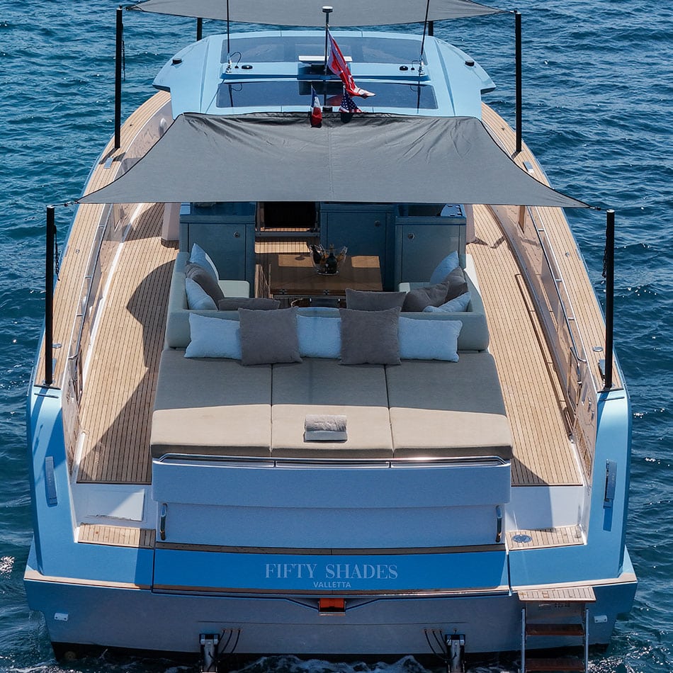 The deck is equipped with spacious sunbathing areas, a high-performance audio system, an outdoor dining area and two large refrigerators, perfect for a festive day at sea. The forward and aft bimini tops with poles, the outdoor shower and the gangway facilitate access to the swim platform or the quayside. Inside, two comfortable cabins and air conditioning provide a pleasant refuge from the sun.