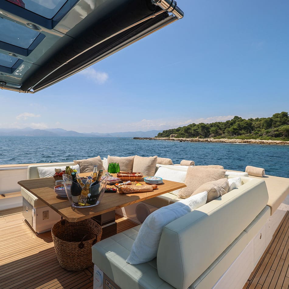 This model also features a high-tech helm station, an ice maker, and a modern toilet, enhancing the feeling of luxury on board. Its reasonable fuel consumption of 150 L/h makes it a powerful and efficient choice for coastal cruises between Cannes, Saint-Tropez, and Monaco.